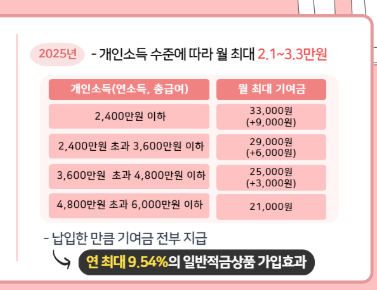 가입자의 소득 수준과 저축 금액에 따라 정부가 매월 최대 2만 4천 원의 기여금을 추가로 지원합니다.