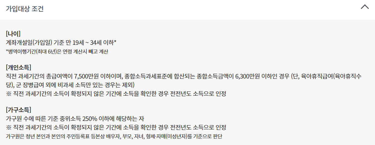 만 19세부터 34세까지의 청년. 단, 군 복무를 이행한 경우 그 기간만큼 최대 6년까지 가입 연령이 연장됩니다.