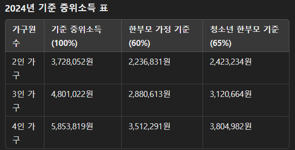 - 청소년 한부모 가족: 만 24세 이하의 부모가 양육하는 가정은 기준 중위소득 65% 이하를 충족해야 합니다.