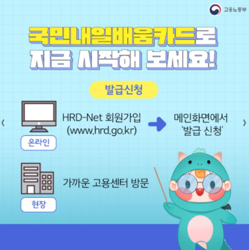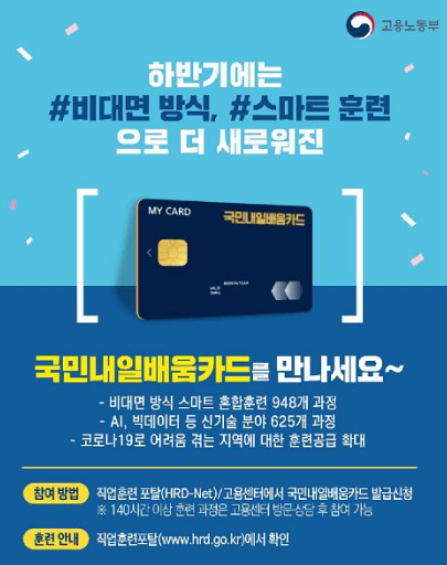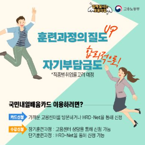 내일배움카드는 고용노동부에서 지원하는 제도로, 직업 훈련 비용의 일부 또는 전부를 지원받아 다양한 교육을 수강할 수 있습니다.