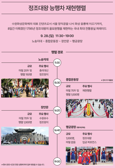 정조가 아버지 사도세자의 능인 현륭원(현 융릉)을 참배하기 위해 한양에서 수원까지 행차했던 모습을 그대로 재현한 프로그램으로, 수천 명의 인원과 수백 필의 말, 화려한 행렬이 장관을 이룹니다.