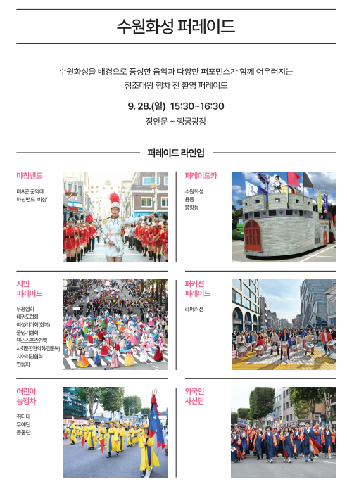 문화제 기간 동안 화성행궁과 수원 시내 주요 거리에서는 다양한 전통 공연과 퍼레이드가 이어집니다.
