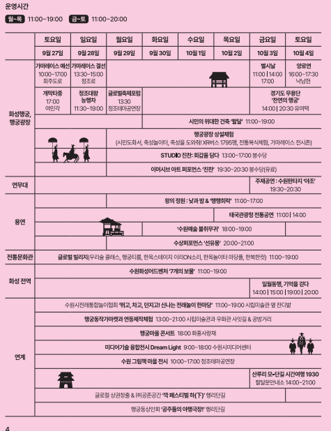 수원 전역이 하나의 거대한 무대가 되는 만큼, 방문객들은 역사와 문화를 동시에 즐길 수 있는 특별한 체험을 하게 됩니다.