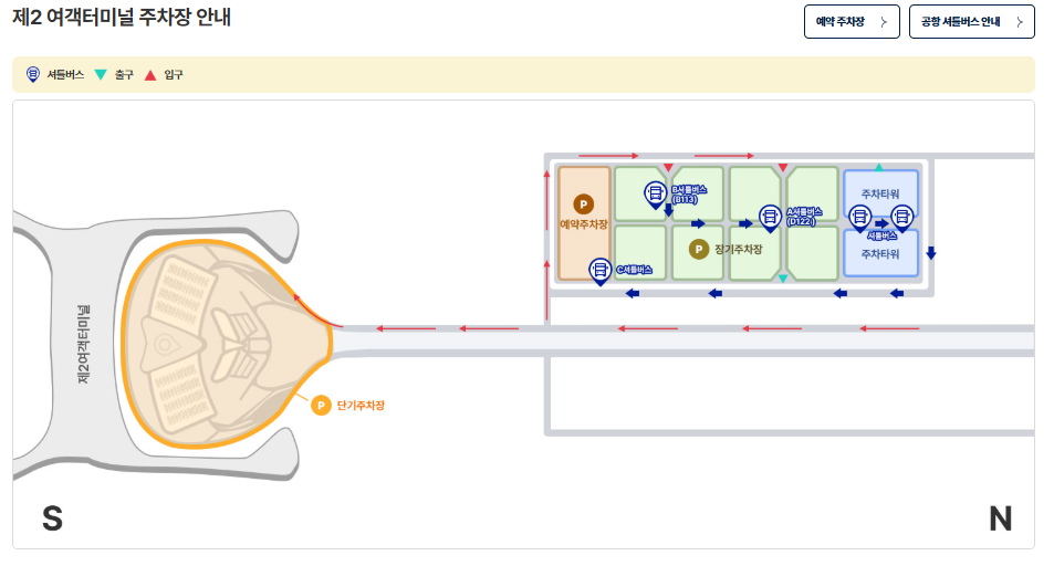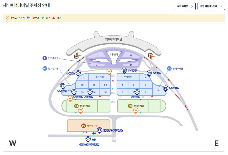 각 주차장은 CCTV와 보안 시설이 완비되어 있으며, 셔틀버스와 도보를 통해 터미널까지 빠르게 이동할 수 있습니다. 주차장 내부에는 EV 충전소, 장애인 전용 공간 등 다양한 편의시설도 마련되어 있습니다.