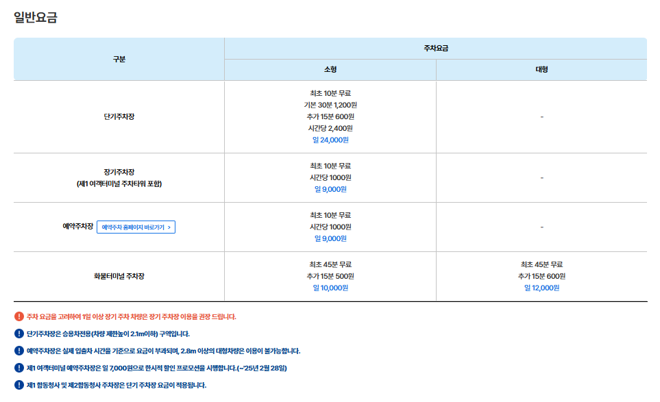 기간: 2025년 2월 28일까지 3. 화물터미널 주차장 요금 화물터미널 주차장은 일반 장기주차장보다 약간 높은 요금이 적용됩니다.