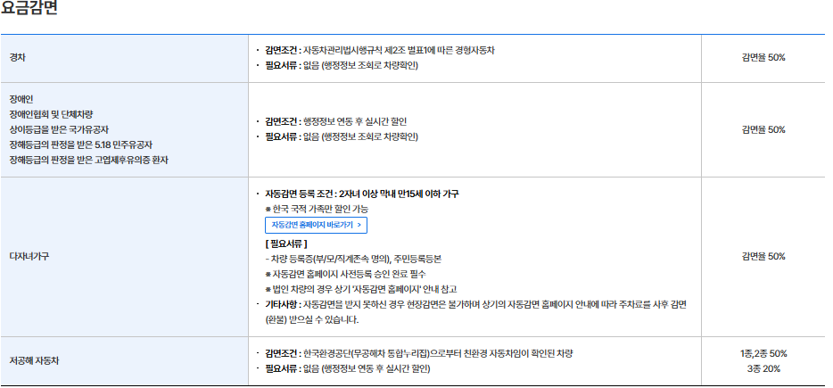 이 외에도 장애인, 국가유공자, 경차는 관련 서류 제출 시 요금 감면 혜택이 제공됩니다.