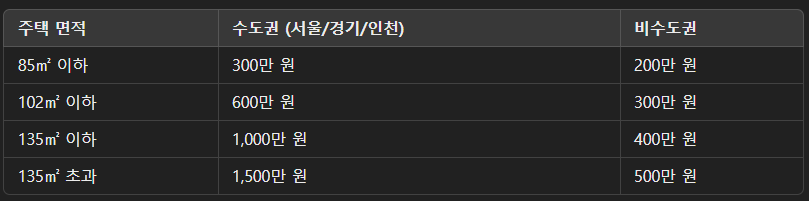 예치금은 신청하려는 주택의 면적과 위치(수도권/비수도권)에 따라 다릅니다.