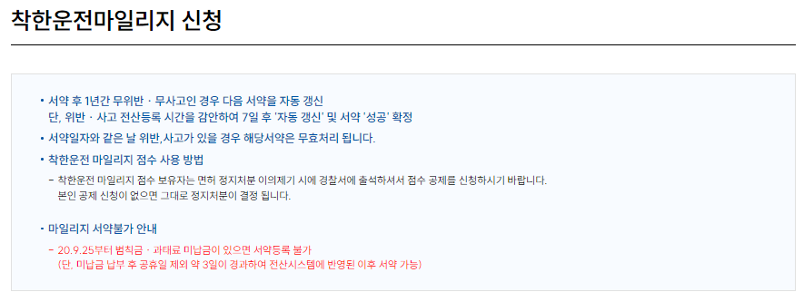 단, 마일리지 적립 조건은 반드시 교통법규 준수와 무사고가 유지되어야 하며, 이를 어길 경우 해당 연도의 적립은 취소됩니다.