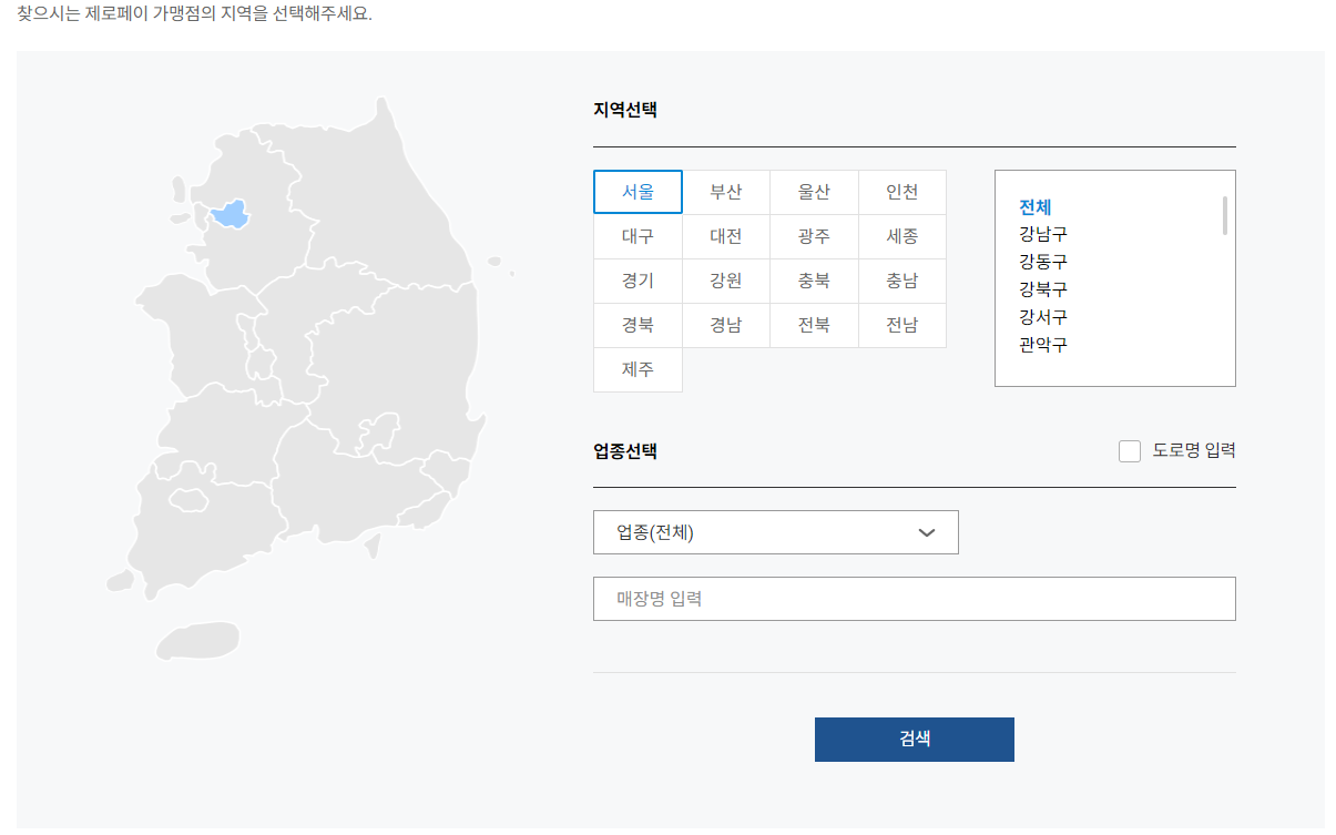 제로페이 홈페이지에서는 가맹점 찾기 메뉴를 통해 지역별, 업종별로 가맹점을 손쉽게 검색할 수 있습니다.