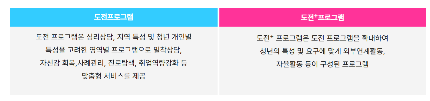 기본적으로 5주 이상 참여하는 도전 프로그램과, 보다 심화된 15주 또는 25주 이상의 도전+ 프로그램으로 구성되어 있으며, 프로그램을 이수하면 일정 수당을 지급받을 수 있습니다.