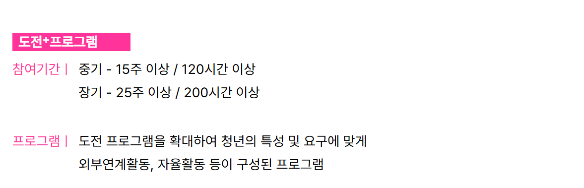 중기 과정: 15주 이상, 120시간 이상 / 장기 과정: 25주 이상, 200시간 이상 도전 프로그램의 확장형으로 외부 연계 활동, 자율 활동, 지역 맞춤형 프로그램 포함 중기 이수 시 150만 원, 장기 이수 시 250만 원 지급 추가 인센티브 제공 (취업 관련 활동 시 최대 50만 원)