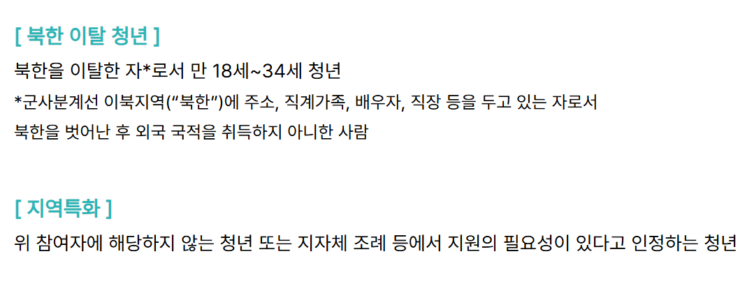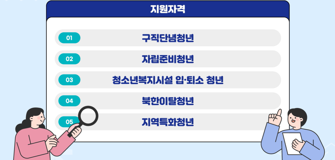 신청 자격은 크게 구직단념청년, 자립준비청년, 청소년 쉼터 입·퇴소 청년, 북한 이탈 청년, 지역특화 청년으로 나뉩니다.