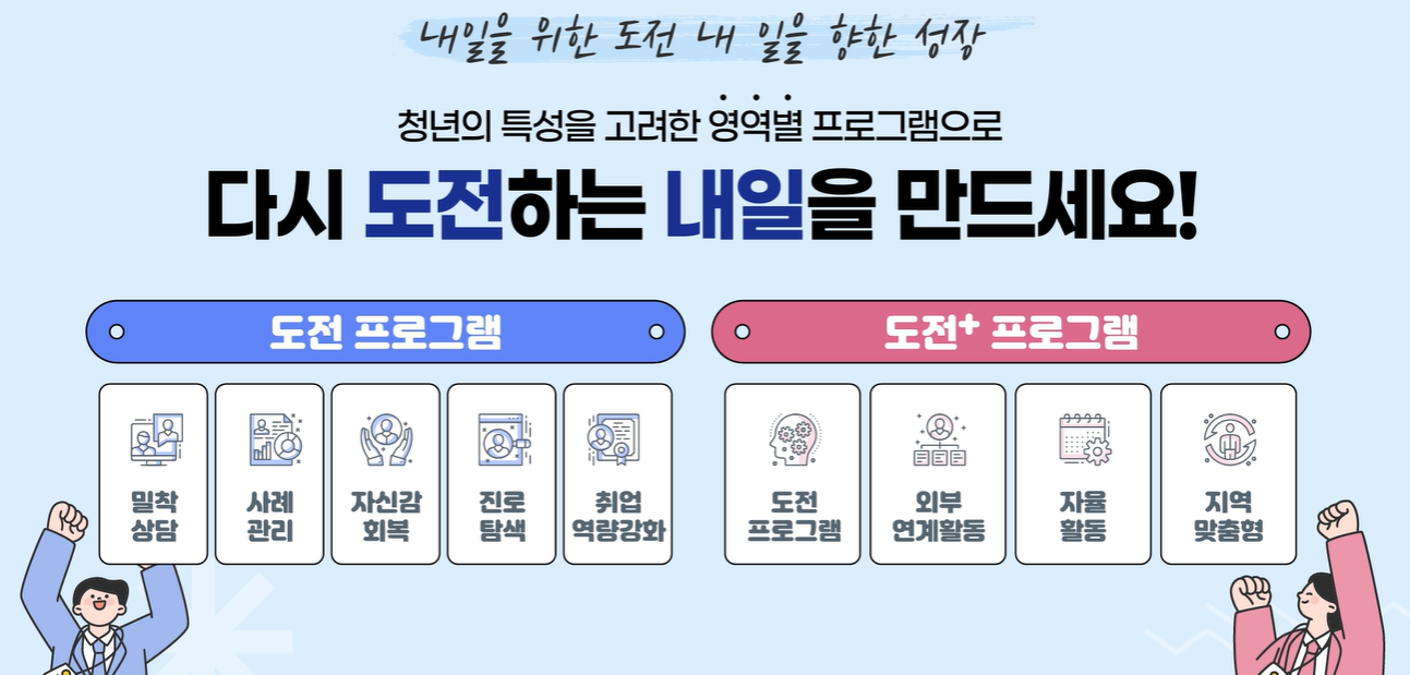 청년도전지원사업은 구직을 단념한 청년들이 다시 한번 도전할 수 있도록 돕는 프로그램으로, 심리 상담부터 직업 훈련, 취업 연계까지 체계적인 지원을 제공합니다.